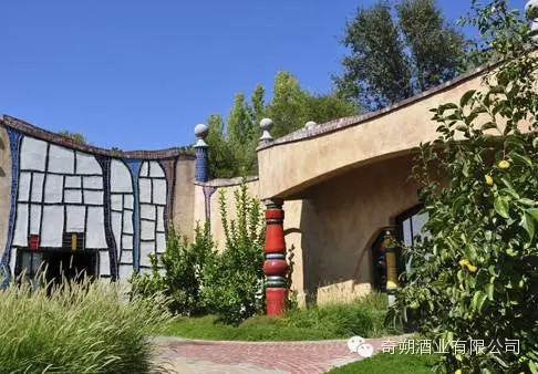 酒庄最神奇的地方还是它秀丽的景色和田园风光,还有与大自然浑然一体的建筑,以及布设在室内的精巧的家具和艺术品。百水先生崇尚自然,漠视对称和规矩的线条,酒庄的建筑、正门和立柱采用鲜亮的瓷砖马赛克装饰,充满童趣的色块让人们感到心情舒畅;金黄洋葱头、魔幻任意窗,建筑与绿树花草相伴而生,交相辉映,营造出自由自在的生活氛围,仿佛隐匿于鹿跃区的童话乐园。这就印证了百水先生的话:来源于自然的纷繁事物构筑起通往天堂的路。